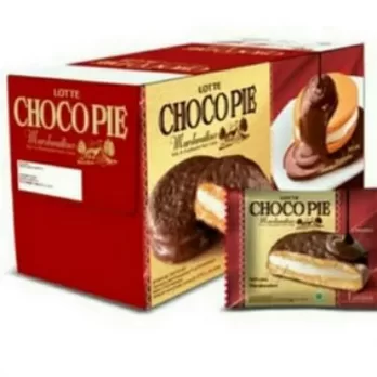Lotte choco pie, Soft cake dengan lapis coklat dan isi marshmallow. Rasanya lembut dimulut, manis dan lezat.