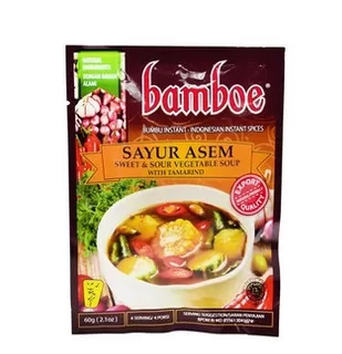 Bumbu Masak BAMBOE Sayur asem adalah hidangan sup sayur populer dengan asam. Berasal dari Jawa. Rasa manis dan asam dari hidangan ini menyegarkan dan biasanya dimakan dengan hidangan goreng, seperti ayam goring (ayam goreng) atau ikan goring (ikan goreng) dan nasi. Bahan untuk hidangan ini adalah buncis, tauge, melinjo, labu, dan jagung. Campuran rempah-rempah untuk Sayur Asem adalah bawang merah, bawang putih, cabai, lengkuas, dan asam.Spesifikasi: Bumbu Masak BAMBOE Sayur Asem